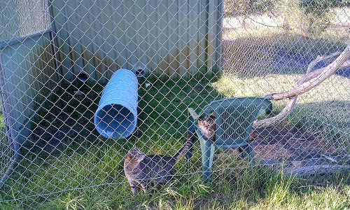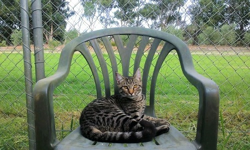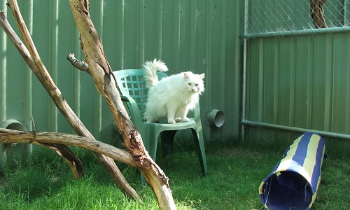 The grassy outdoor areas are covered with shade cloth and equipped with a play tunnel and a lawn chair where your cat can day-dream and take in the serenity of the surrounding countryside. Your cat will not meet any other cats in the outside run, only cats from the same family are let outside together.